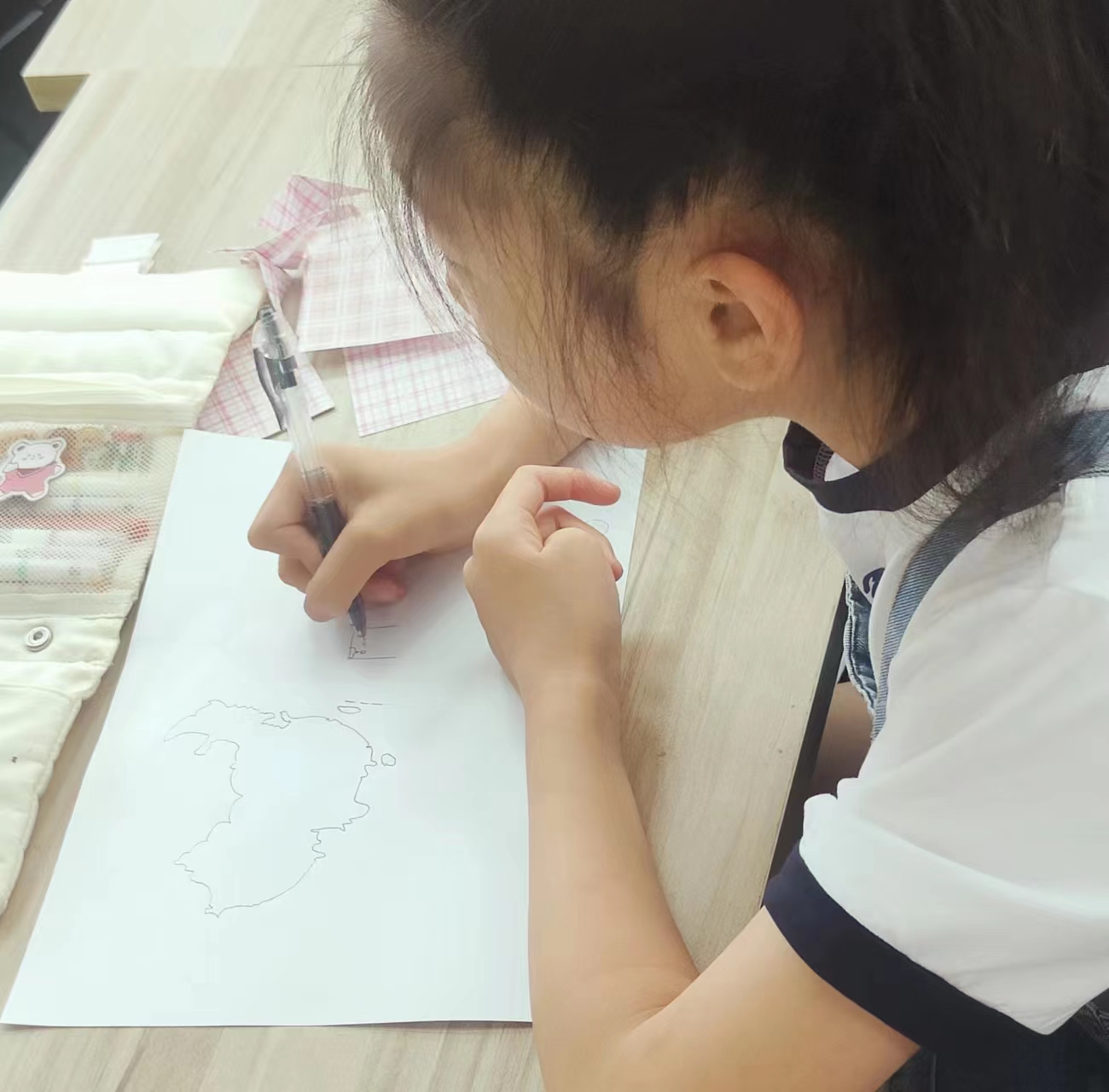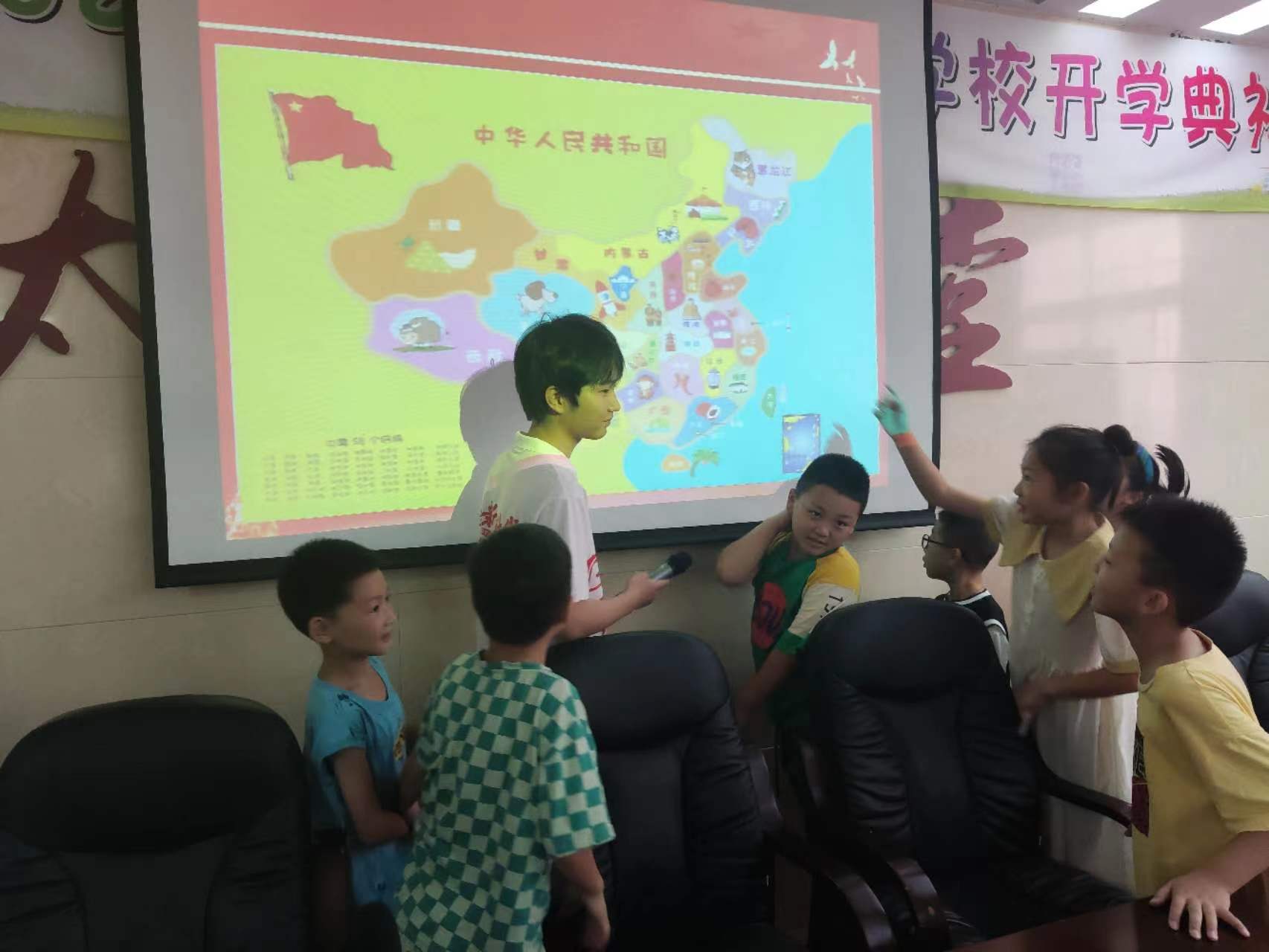 为了加深孩子们对中国地图的认识,志愿者随后设置了动手绘画中国地图环节。在动手绘画环节中,孩子们拿起彩笔,运用自己的彩色表达形式,在纸上绘出自己心中的中国地图,表达对祖国的热爱。
