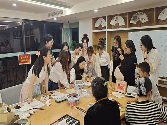 蒋老师让学员把绘画的过程拍成视频发到群里,一边巡视教室,逐个指点学员,在老师的指导下,学员们逐渐掌握了绘画的精髓,加上自己的创意,完成了自己的第一幅手绘团扇。