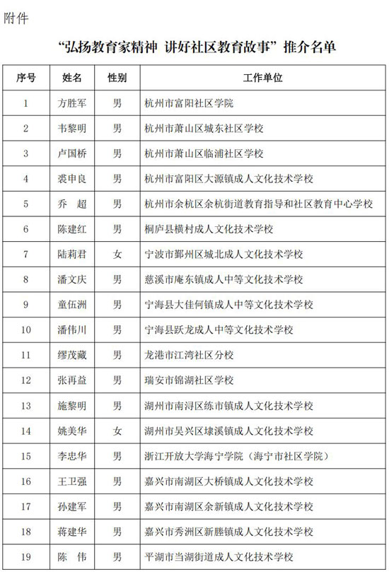 根据《关于开展“弘扬教育家精神 讲好社区教育故事”推介活动的通知》(浙成职协〔2024〕11号)要求,在各地推荐和专家评审基础上,经省成职教协会审核和公示,现将“弘扬教育家精神 讲好社区教育故事”推介名单予以公布(见附件)。