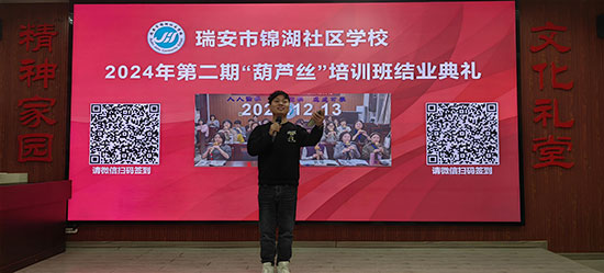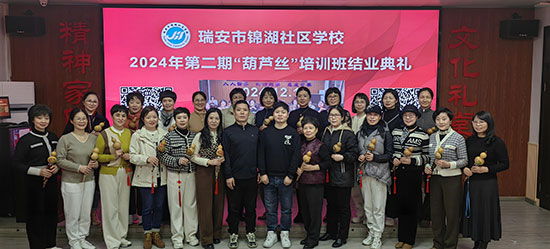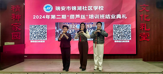 随着最后一个音符落下,本期葫芦丝培训正式画上圆满句号。这场结业典礼不仅是对学员们学习成果的肯定,更是对他们未来艺术之路的美好期许。相信在瑞安市锦湖社区学校的大力支持和刘明明导师的专业引领下,这些热爱葫芦丝艺术的学员们将继续在音乐的道路上砥砺前行,创造更加辉煌的成绩,为葫芦丝艺术的传承与发展注入新的活力。(张再益)