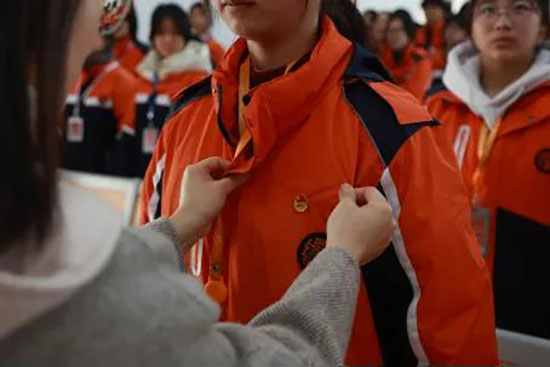 随后,团委老师们庄重地为新团员佩戴团徽、颁发团员证。新团员们神情肃穆,动作严谨,接过承载着团组织信任与期望的团徽和团员证,这不仅是一份荣誉,更标志着他们正式融入共青团这个温暖的大家庭,开启了人生新的征程。