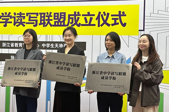 成立仪式上,副校长朱晓慧作为学校代表领取“浙江省中学读写联盟成员学校”铜牌,学生处处长杨育萍领取浙江省中学读写联盟颁发的指导师聘书。