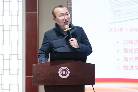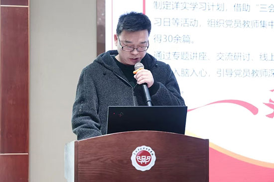 学校党委书记范晓春作2024年度党建工作总结。从深化“四足立鼎”党建主品牌、强化“三学三思”学习辅品牌和打造“四色四清”清廉辅品牌三个方面,汇报了学校党委通过积极塑造兼具职教特色、专业亮点及文化底蕴的党建品牌体系,扎实推进党组织领导的校长负责制,党建引领推进校园文化建设、人才培育、师资发展、产教融合等各方面的工作情况。她结合学校新一年重点工作规划,对各支部2025年的工作提出了三点要求:一是“榫卯筑顶”,完善顶层设计,优化支部管理党员形式,提升支部治理质效;二是“术业砼柱”,创新合作交流,拓展支部互助共建渠道,凝聚党建发展合力;三是“画栋雕梁”,增加考评体系,激励全体党员担当作为,彰显多元内涵素养。