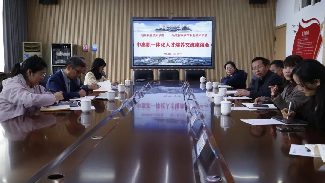 胡国荣则详细介绍了湖州职业技术学院的长远发展规划、新校区建设情况以及二级学院的设置现状。他表达了对两校未来进一步加强沟通交流的期待,并希望双方能够聚焦核心课程、教育教学等关键衔接环节,共同推动优势互补、创新融合的中高职一体化协同育人模式,不断提升人才培养的质量与水平。