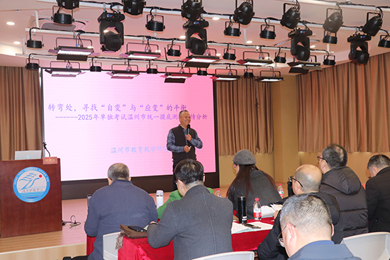 随后,温州市教育教学研究院教研员叶思义老师作了题为《转弯处,寻找“自变”与“应变”的平衡》的专题讲座。叶老师对2025年高职单独考试温州市统一摸底测试成绩进行了深入分析,并结合当前职业教育发展趋势,提出了“自变”与“应变”相结合的教研思路,为与会者提供了宝贵的参考。
