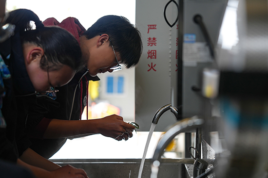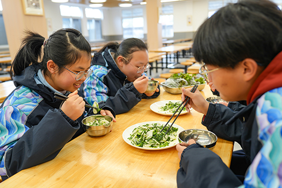 采挖结束,同学们手捧满是泥土的荠菜,来到后厨分拣、清洗,制作品尝宁波传统菜肴荠菜炒年糕。从田间到餐桌,不到1个小时,新鲜透骨的荠菜年糕让同学们直呼吃得过瘾。有细心的同学发现:烧熟的荠菜仿佛变身了,从原本的暗沉无光变得青翠欲滴。
