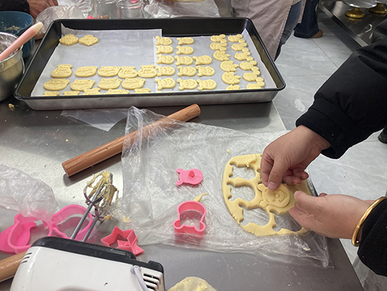 活动现场,烘焙教室变身“创意工坊”。教师杨晹从饼干面团调配、模具使用技巧到烘焙温度控制逐一讲解,并重点示范了卡通饼干的制作流程。学员们选用小兔、花朵、love等造型模具,将面团压制成形态各异的卡通图案。大家边学边做,互相交流创意,现场气氛温馨热烈。经过烘烤,一盘盘金黄酥脆、造型生动的卡通饼干新鲜出炉,学员们纷纷举起作品拍照留念,成就感满满。