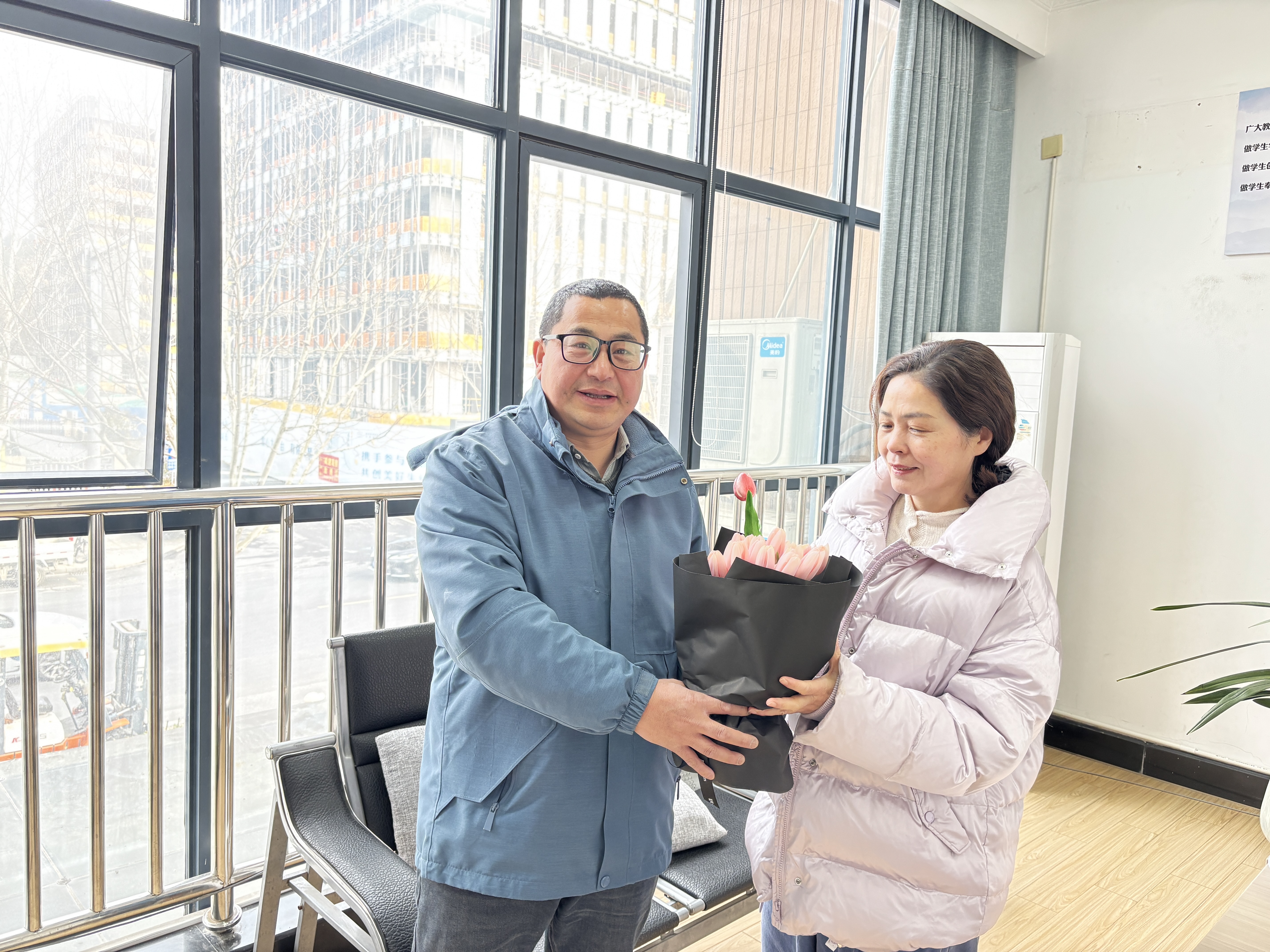 随后,学校行政开展“实干争先 鲜花送暖”慰问女教职工活动。副校长张虎代表全体男教师向女教师致以节日的祝福,感谢女教师长期以来为学校所做的贡献,并送上鲜花和慰问品,鼓励大家不负韶华、砥砺前行,继续发扬巾帼不让须眉的精神。
