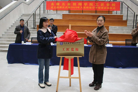 在热烈的掌声中,朱惠静与李卓共同为“永康五金技师学院工匠党校”正式揭牌,并为王灿灿等五名同志颁发了工匠党校第一批教员聘书。