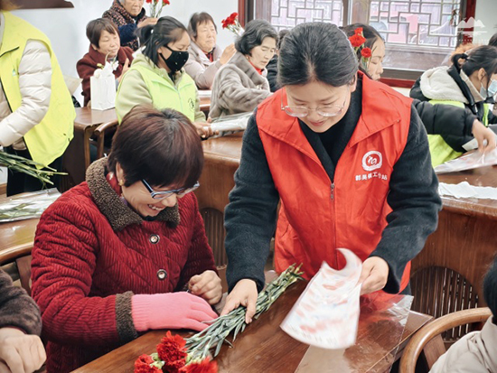 活动现场,26位特殊女性在志愿者指导下学习花材修剪、色彩搭配与造型设计技巧。康乃馨、向日葵与满天星在巧手编织下渐成缤纷花束,花香与欢笑充盈整个空间。78岁的独居老人张阿姨捧着作品感慨:“没想到这辈子还能亲手扎这么漂亮的花,心里暖洋洋的。”