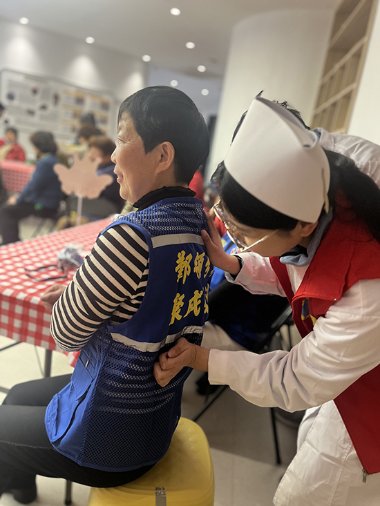 现场,围绕与生活息息相关的养老康复主题,同学们发挥专业所学,为居民普及知识、传授技能。大家各有分工,彭馨慧负责解腰肌劳损、肩周炎预防及治疗宣讲。其他同学或演示肌肉推拿,或走到居民身边,手把手指导传授正确手法。随后,同学们为居民测量血压和血氧,并把制作好的中药包赠予大家。