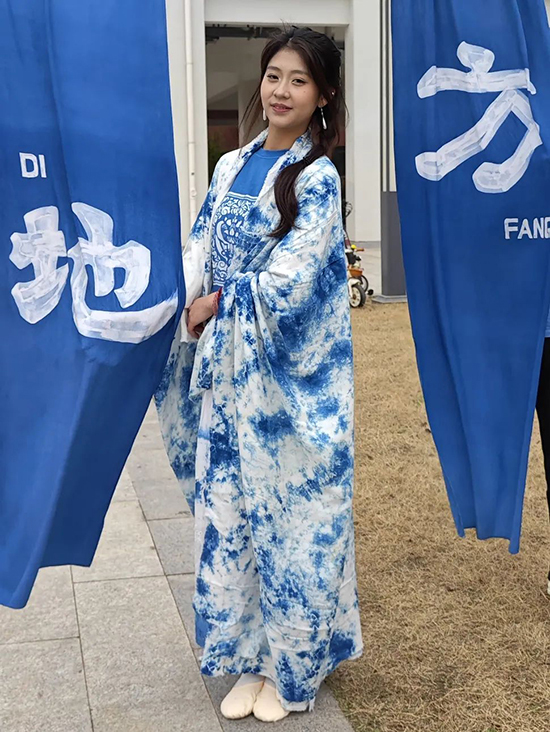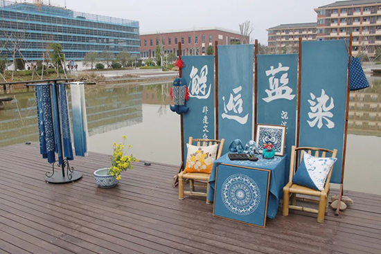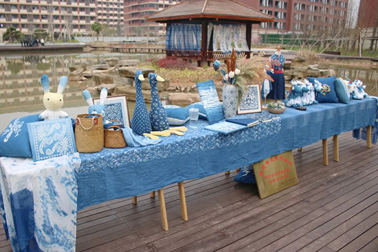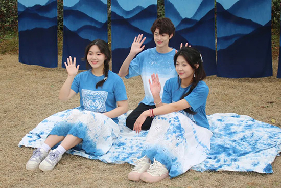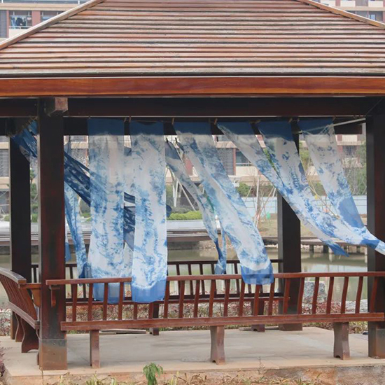 活动于中午在湖畔草坪隆重举行。在“青逢布落”靛青白花印染工作室的布置下,飘逸的蓝印染丝巾与天空交相辉映,营造了一个轻松愉悦的氛围。