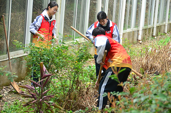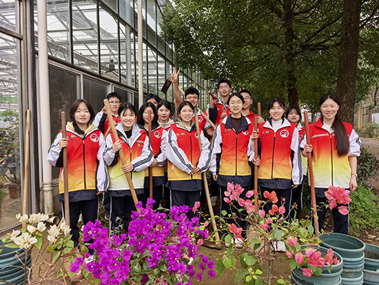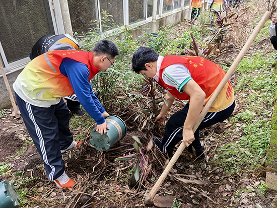 活动现场,身着红马甲的志愿者们分工协作,挥锹铲土、扶苗培土、提水浇灌,在园林专业教师指导下种植了20余株三角梅和紫背竹芋。热烈奔放的三角梅与叶片斑斓的紫背竹芋相互映衬,为场馆外立面勾勒出生机盎然的生态景观带。
