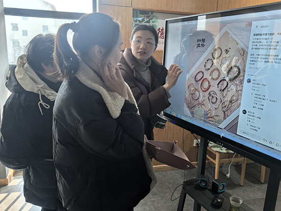 活动伊始,成校教师以手串文化为切入点,介绍玉石、水晶等天然材质的文化寓意及编织技艺的历史传承。随后,来自安吉相拾珈工作室的专业手作老师苏珈现场示范选珠、配色、穿绳等步骤,并针对中老年人手部灵活性特点,采用“慢速分解教学+一对一指导”模式,确保参与者轻松掌握技巧。活动现场,老年妇女们化身“银龄设计师”,在琳琅满目的琉璃、玛瑙、菩提等材料中精心挑选,将色彩与纹理进行创意搭配。过程中,大家相互探讨编织手法,分享生活趣事,现场洋溢着温馨欢乐的氛围。