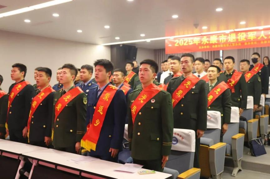 伴随着庄严的国歌,仪式正式拉开帷幕。全体退役军人重温军人退役誓词,誓言铿锵有力,彰显出他们 “退伍不褪色” 的坚定信念。返乡退役军人代表施承远在发言中分享了自己的军旅生涯与未来规划,表达了对永康建设的热切期盼。