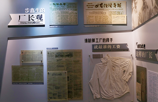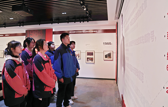 师生在讲解员的引导下有序参观。陈列馆内,一幅幅珍贵的历史照片、一件件承载着时代记忆的实物展品、一段段生动详实的影像资料,生动再现了步鑫生在改革开放初期,以非凡的勇气和魄力,打破旧有体制机制束缚,推动海盐衬衫总厂走向辉煌的奋斗历程。