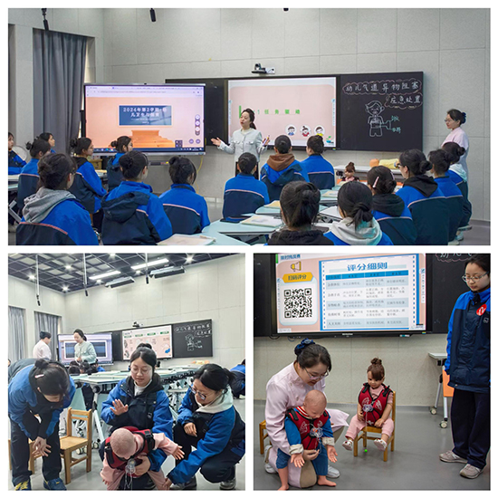 第三个议程为公开课交流展示研讨,由诸暨市职教中心的张艳老师与绍兴护士学校的石佳茹老师携手合作,共同聚焦气道异物阻塞这一高发的意外场景。两位老师紧密围绕教学标准中关于掌握预防与规范处理幼儿常见意外伤害及其他突发事件的知识与技能要求,展开了深入的教学实践。她们创新采用“虚实结合+双师协同”的教学模式,有效破解了教学难点。通过虚拟仿真平台进行交互式急救流程的预演、借助海姆立克急救马甲进行辅助练习,使急救效果可视化;在双师共导的模式下,实现了“医育融合”的教学理念,将医疗急救与幼儿保育紧密结合。此外,老师们还将“生命至上,急救有方”的理念融入课堂,深厚了学生的职业情怀。课堂效果显著,获得了广泛好评。