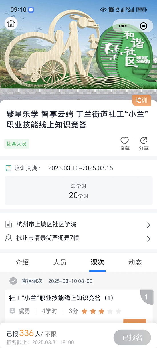 为迎接世界社会工作日的到来,深入贯彻落实新时代基层治理现代化要求,加强社区工作者队伍建设,创新社区工作者培育模式,上城区社区学院、上城区社会工作协会、丁兰街道社会工作站、丁兰街道人力资源和社会保障管理站联合承办“繁星乐学 智享云端”—社工“小兰”社会工作职业技能知识竞赛。此次活动吸引了街道336名社区工作者积极参与。