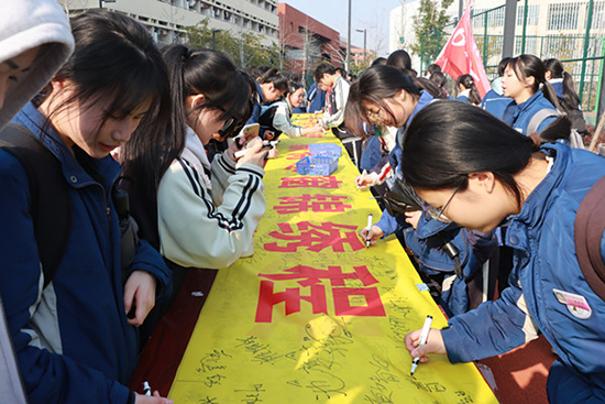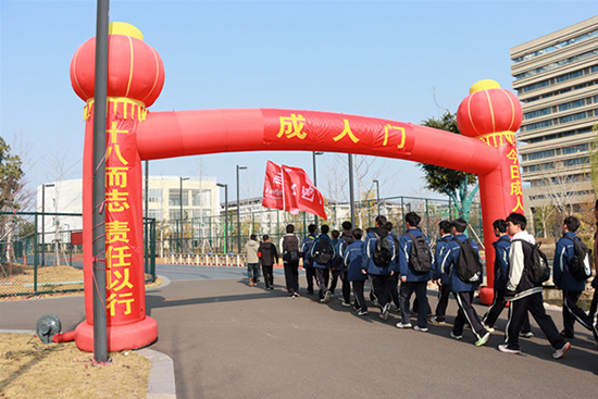 毅行结束后,学生从西门有序通过成人门进场,正式步入成人仪式环节。在成人门旁,设置了庄重的签名墙,同学们依次上前,郑重地签下自己的名字,每一笔每一划都饱含着对未来的期许与承诺。当踏入成人门的那一刻,仿佛有一种无形的力量注入到每一位同学的心中,他们带着对未来的憧憬与期待,呐喊着冲过成人门,那激昂的呐喊声,如同战鼓擂动,久久回荡在校园上空,彰显着他们迈向成人的坚定决心。