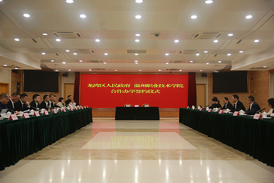 在与会领导的共同见证下,龙湾区区长夏禹桨与温职院校长郑信军就合作建设温州职业技术学院附属龙湾区职业技术学校签订合作办学协议,温职院党委委员刘海明给龙湾区职业技术学校校长郑源贺授以“温州职业技术学院附属龙湾区职业技术学校”牌匾。
