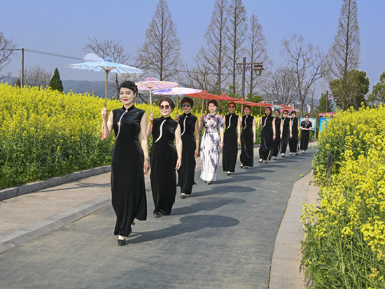 只见形体走秀班的学员们身着旗袍,在花海间迈着优雅的步伐。她们身姿婀娜,一颦一笑、举手投足间尽显自信风采,与烂漫春光相互交融,构成了一道道亮丽的风景线。摄影班学员们则穿梭其中,全神贯注地用手中相机定格美好瞬间。为了让摄影班学员们有更多的拍摄素材与独特视角,授课教师陈定根更是别出心裁,将自己的乌篷船划到河边。在悠悠的乌篷船上,陈老师一边亲身示范,一边为学员们讲解如何拍摄水乡特色与人物景致融合的照片,让学员们近距离领略“小桥流水人家”的江南韵味。