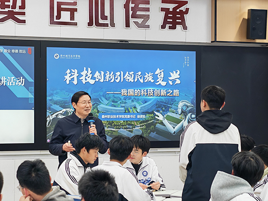 衢州职业技术学院党委书记徐须实专程来到衢州第二中专,他为区域中高职一体化家具设计与制作、机械加工技术专业的学子们带来了一堂生动的思政课——《科技创新引领民族复兴——我国的科技创新之路》。江山市教育局副局长王以洪出席本次活动,与师生一同聆听学习。活动由衢州第二中专党委书记徐凌志主持。