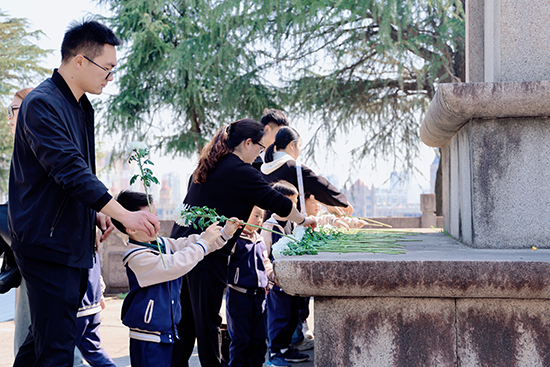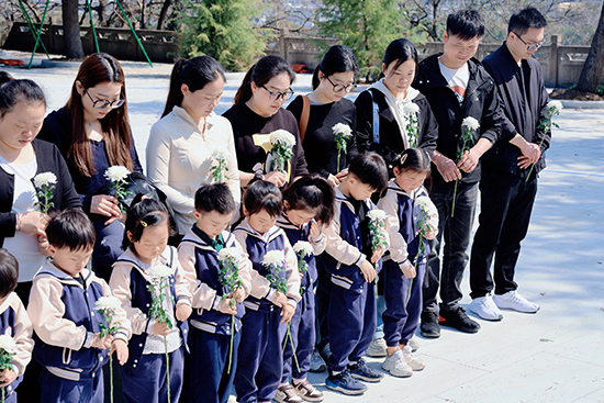 上午9时,全体家庭手持小菊花列队肃立。家委会代表向孩子们讲述纪念碑象征意义后,全体人员面朝纪念碑深深三鞠躬,并低头默哀一分钟。春风轻拂过孩子们手中的花束,稚嫩的眉眼间透出难得的庄重。“英雄们的故事就像星星一样亮晶晶的”,家委会成员用童趣比喻诠释默哀意义,孩子们似懂非懂地点头,小手紧紧攥着家长衣角。紧接着,亲子家庭手牵手缓步绕行纪念碑。孩子们用指尖触摸碑体镌刻的岁月痕迹,将精心准备的菊花轻放碑前。朵朵白菊,将抽象的爱国情怀转化为可触可感的成长体验。它不仅寄托着对先烈的哀思,更在孩子们心中勾勒出责任与传承的雏形。