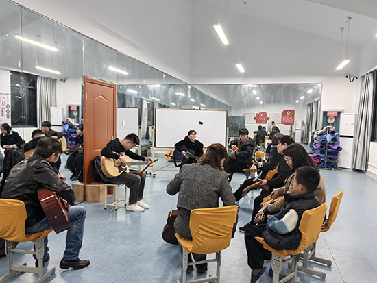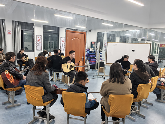 从基础指法到乐队合奏的渐进式培养课程设计,充分考虑零基础学员需求,前四周聚焦《小星星》《生日歌》等简单曲目,中期引入流行歌曲弹唱,结业时将举办学员音乐汇报活动。“我们特意选用37寸旅行吉他,减轻初学者通勤负担。”作为兰亭成校“终身学习生态圈”的重要板块,青蓝夜校除吉他课还开设瑜伽爵士舞等课程。