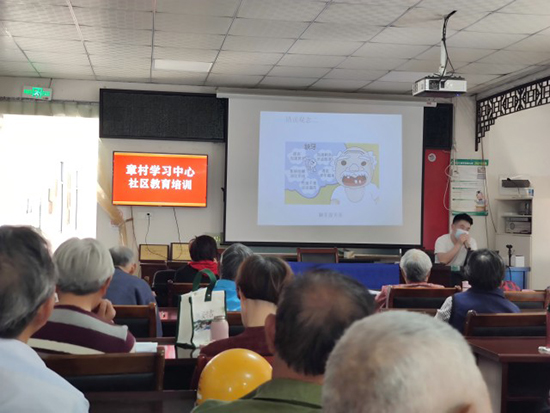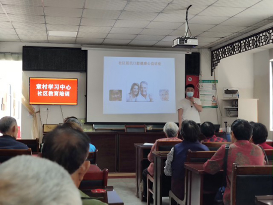 本次培训由安吉县社区教育学院章村学习中心、安吉普康及章村村幸福邻里中心联合组织,特邀安吉复大口腔赵志医生为村民们授课。赵医生以生动的语言、形象的图片,详细讲解了中老年人常见的口腔问题及预防方法,如牙齿松动、牙龈出血、口腔溃疡等。