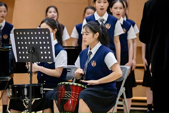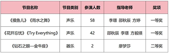 浙江省湖州艺术与设计学校参演节目表现不俗,均获得了优异的成绩。器乐作品《钻石之眼·金牛座》用钢琴和扬琴的双重奏形成文化对话;声乐作品《花开忘忧》传递治愈力量,《Try Everything》则以活力四射的合唱点燃全场。《摸鱼儿》以现代编曲诠释古诗词,《雨水之舞》的空灵和声模拟自然韵律,生动诠释艺校学子对生态理念的艺术表达。(许竹婷)