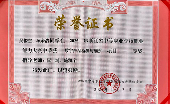 在刚刚结束的2025年浙江省中等职业学校职业能力大赛“数字产品检测与维护”项目赛项中,由杭州闲林职业高级中学22电子大专吴俊杰同学和24级网络安防班项余浩同学组成的队伍(指导老师团队:阮鸿、施凯宇、金峰、陈迪龙),经过4个小时的激烈竞争,最终以总分第一的成绩获得该项目的第一名。