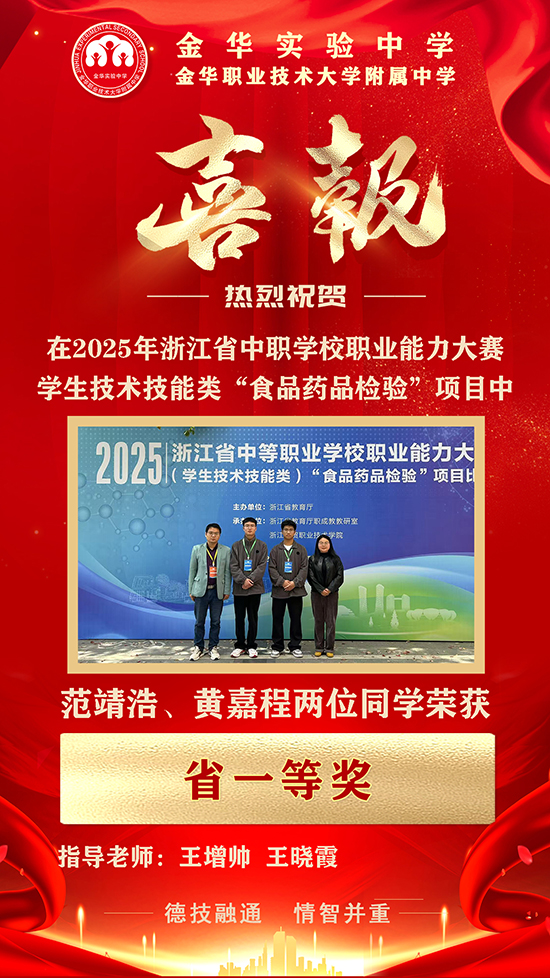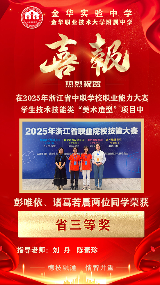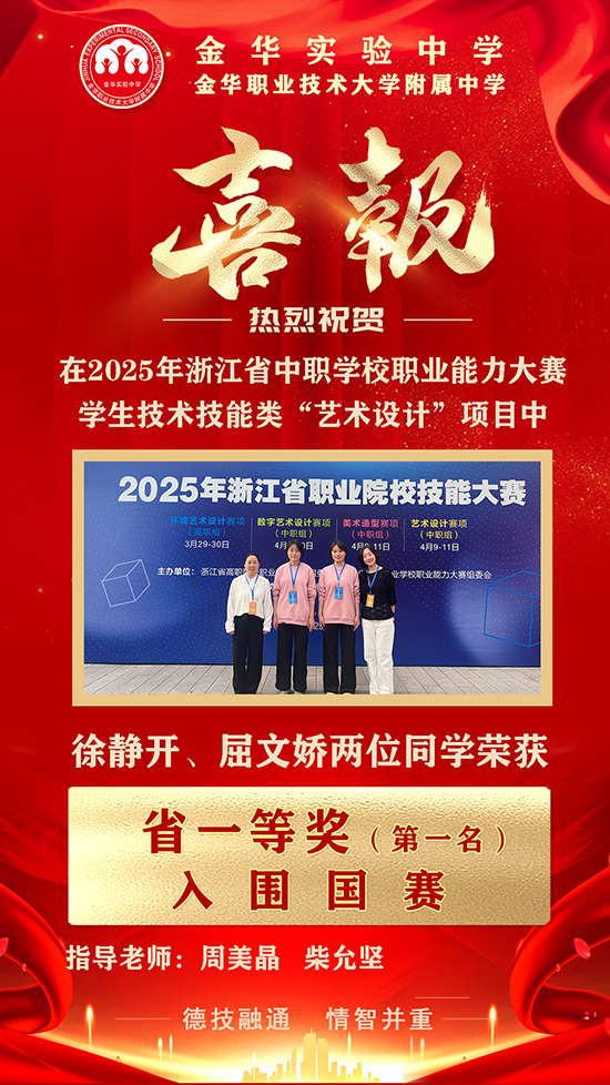 近期,2025年浙江省职业院校技能大赛圆满落幕,金华实验中学在多个赛项中斩获佳绩,取得三个省一等奖、一个省三等奖,其中“婴幼儿保育”“艺术设计”两大赛项更是夺得第一名,将代表浙江省出征国赛!学校的技能培养与高考升学成绩持续领跑同类学校,彰显“双线并进”的育人实力。