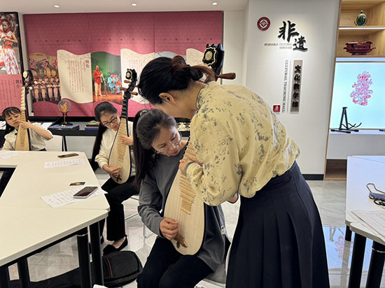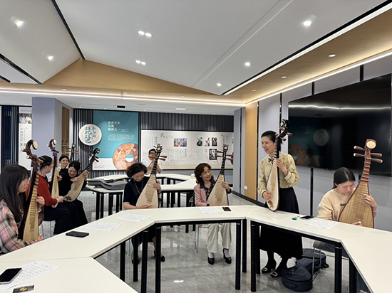 平湖派琵琶课堂上,悠扬的琵琶声在教室里回荡,学员们在黎庆慧老师的指导下,手指轻轻拨动琴弦,感受着传统音乐的韵味。