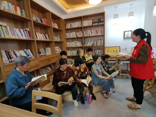 活动现场,杨林娇老师通过“阅读讲座+好书分享”的形式,带领老人们重温经典名著、品析养生知识类书籍,并贴心指导老年人掌握科学阅读方法。在“银龄朗诵”环节,学员们轮流诵读《平凡的世界》《论语》等经典片段,声情并茂的演绎赢得阵阵掌声。自由讨论阶段,老人们争相分享读书感悟,推荐《长寿之道》《乡土中国》等书籍,现场气氛温馨热烈。72岁的学员李阿姨感慨:“小时候没有读多少书,老了还能读书,仿佛回到了童年!”