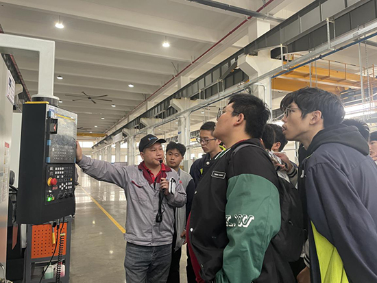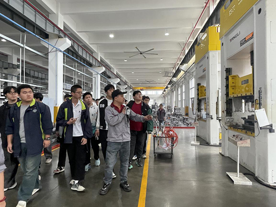 4月24日上午9时,学生们出发前往公司,在公司办公室主任王意博的引领下,学生们首先参观了吉沃科技的生产车间。生产线上的工人们熟练地操作着各种高精尖设备,汽车零部件从原材料到成品的每一个生产环节都尽收眼底。来到模具车间cnc工作区域,学生们近距离观察了工人们如何操作精密的机械设备,大家纷纷感叹科技企业的生产环境像一个充满未来感的‘科技实验室’,并表达了特别想要进入吉沃科技学习cnc数控加工技术的愿望。