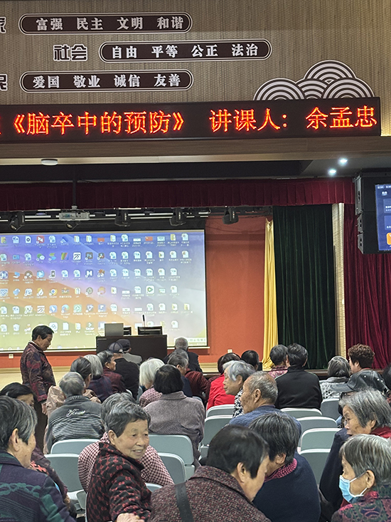 讲座现场互动频频,余老师通过真实病例分析,纠正“冬季才需预防”“ 血压正常就安全”等认知误区。当大屏幕展示脑部血管造影图时,前排76岁的陈大伯感慨:“原来血管堵塞这么危险,以后真得管住嘴多动腿。”现场还发放了《脑卒中自测手册》,医护人员为有需求的老人进行免费血压测量。