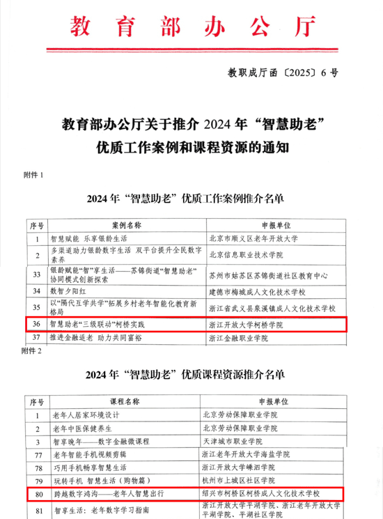 日前,教育部办公厅下文公布了2024年“智慧助老”优秀工作案例和课程资源推介名单,柯桥区有2项成果荣登推介榜,它们是:浙江开放大学柯桥学院的优秀工作案例《智慧助老“三级联动”柯桥实践》和柯桥成校的优质课程资源《跨越数字鸿沟——老年人智慧出行》。全省总共上榜优秀工作案例6项、优质课程资源12门,柯桥区上榜优秀工作案例、优质课程资源各1项(门),是绍兴市唯一;全省同时上榜2项成果的区县级单位仅杭州市上城区和绍兴市柯桥区两家。
