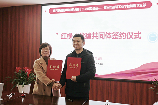 双方还举行了“大中小学思政课一体化建设”签约及授牌仪式,中共嘉兴职业技术学院机关第十二支部委员会与中共嘉兴建筑工业学校清馨党支部委员会签订了“红椽”党建共同体合作协议。