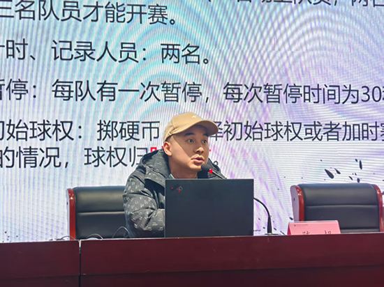 随后,陈超老师为全体参赛队员和裁判员进行了详细的规则解读和培训。陈超老师结合自身丰富的执裁经验,细致入微地讲解了篮球比赛规则、裁判手势以及注意事项,并针对同学们容易出现的犯规动作进行了重点讲解和示范。陈老师对裁判员提出了严格要求,务必做到公平对待每一支队伍、公正吹响每一声哨音;同时,也殷切期望参赛队员们能够始终秉持尊重对手、尊重裁判的体育精神。培训期间,同学们全神贯注,积极互动。