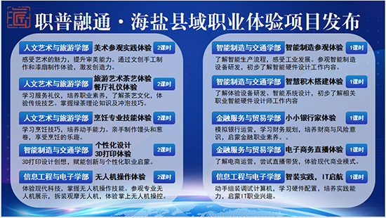 为推进“职业启蒙”教育,推动职业理念、职业技能、职业素养与普通教育相互融通,海盐职业教育中心特组织开展2025年度“职普融通示范日”活动。