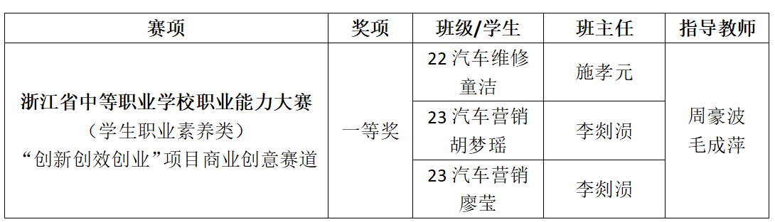 本次大赛由浙江省中等职业学校职业能力大赛组委会主办、浙江省教育厅职成教教研究室承办。自获得绍兴市创新创业大赛一等奖并成功晋级省赛以来,学校创业团队在精进汽车营销专业知识和技能的基础上,积极推进《车脉云检——车辆鉴定评估的创新创业实践》项目,深入二手车市场调研,抓准市场需求及行业痛点,反复打磨解决方案,努力提升项目市场价值,将创意淬炼成赛场上的亮眼成果,获得了现场评委的一致认可,最终得以在全省11个地市150支队伍中脱颖而出。这一历史新突破,是对学校双创教育成果的又一次肯定。