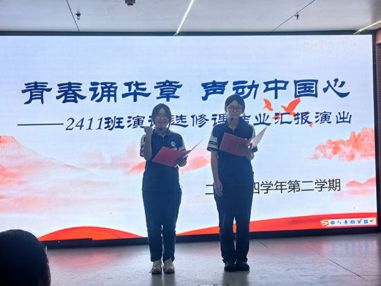 汇报演出圆满收官,标志着为期一年的演讲选修课行将结束,2411班全体同学用深鞠躬、“何老师,谢谢您”表达对指导老师的感恩与不舍之情。同学们表示:活动虽已结束,但课程赋予的自信表达、深刻思辨和文化认同,已深深融入他们的成长脉络,成为他们面向未来的宝贵财富。未来,同学们将怀揣对语言艺术的热爱,以更昂扬的姿态,向更好的自己踔厉奋发、勇毅前行。(华文浩)