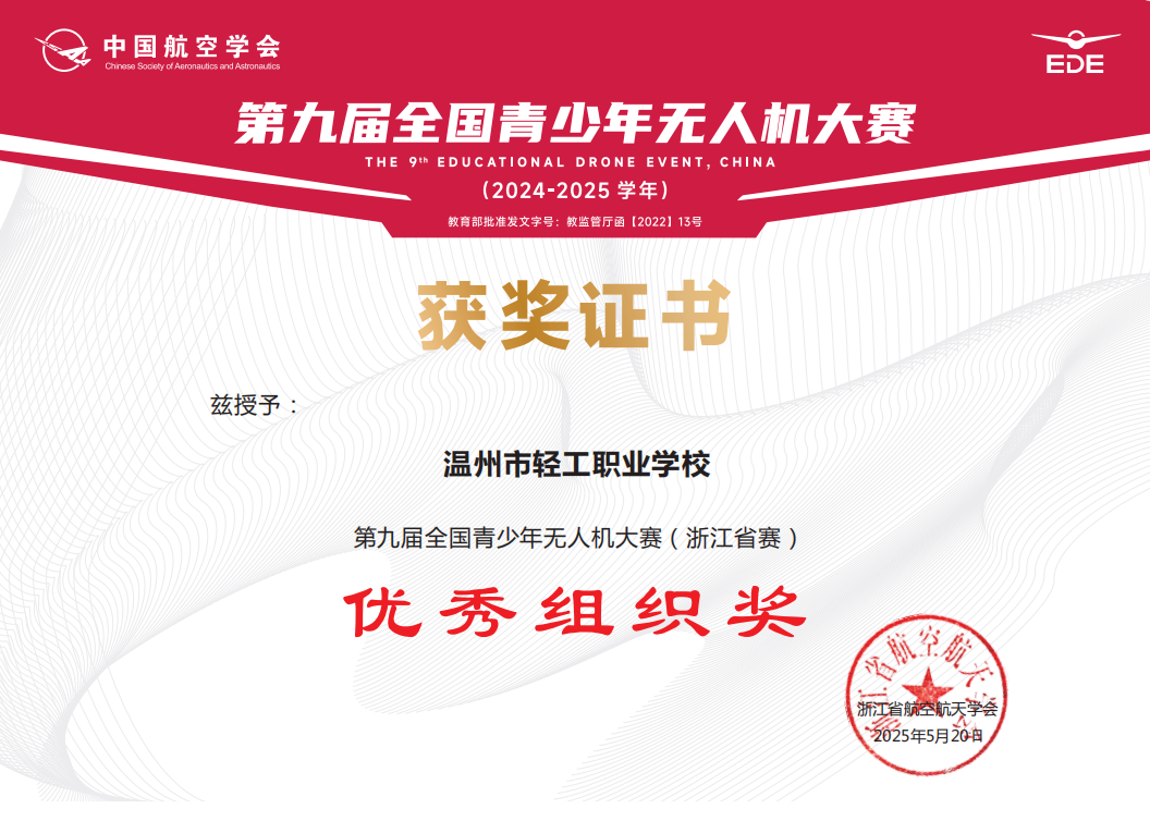 此次大赛,报名人数突破4000人,吸引全省300余所中小学、职高的青少年选手同场竞技。温州市轻工职业学校共计11名同学参加,经过努力拼搏,全员取得喜人的成绩,学校也荣获优秀组织奖!学校同学多人入围国赛,期待他们在国赛舞台上更加出色的表现。