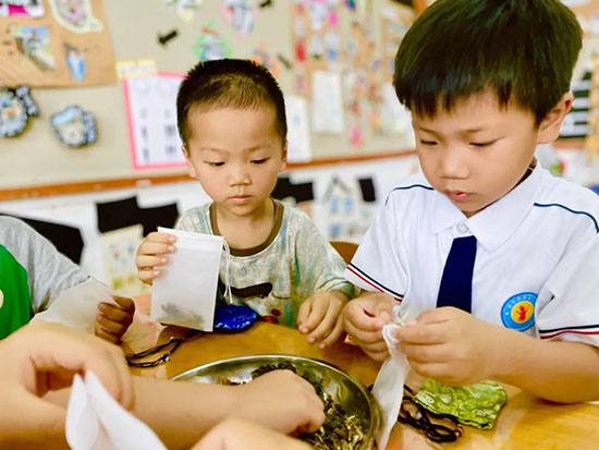 作驱蚊香囊:准备好艾叶、藿香、丁香等10多味中草药,耐心地按不同份量放入自制的各式香囊袋中,填满后抽紧绳子,一个香喷喷的香囊就完成了,承载着快乐和健康!