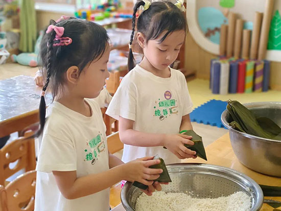 包粽子:“糯米白花花,粽叶手中拿,裹住甜蜜馅,卷起香粽叶,粽子包好啦!”在老师的指导下,幼儿们念叨着儿歌,一手拿粽叶,一手勺糯米,不忘放进不同的馅料。不一会儿,形状不一的粽子产生了,煮熟,吃着香甜软糯可口的粽子别提有多开心了。
