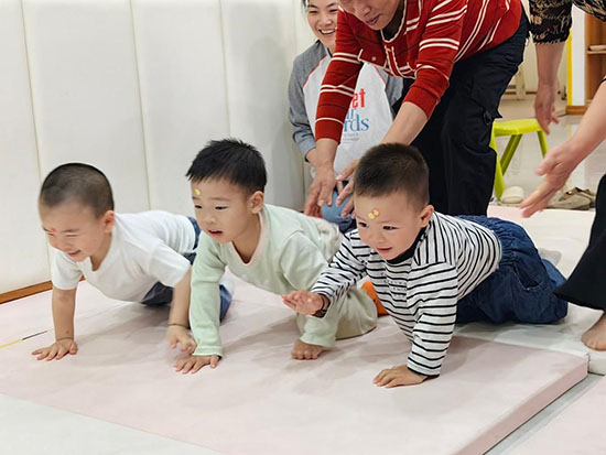 最具挑战性的“爬爬拿玩偶”体能环节,教师团队巧妙设置弯道、障碍物等趣味赛道,以毛绒玩具作为目标物激发爬行动力。当孩子们手脚并用地冲向终点时,教师实时蹲身引导:“膝盖抬起来,加油往前爬!”家长们则在赛道两侧用掌声助力,该环节不仅锻炼了幼儿肢体协调性,更通过即时正向反馈增强了勇气与自信。活动现场氛围热烈,寓教于乐的形式显著提升了亲子互动质量,赢得了家长们的一致点赞。