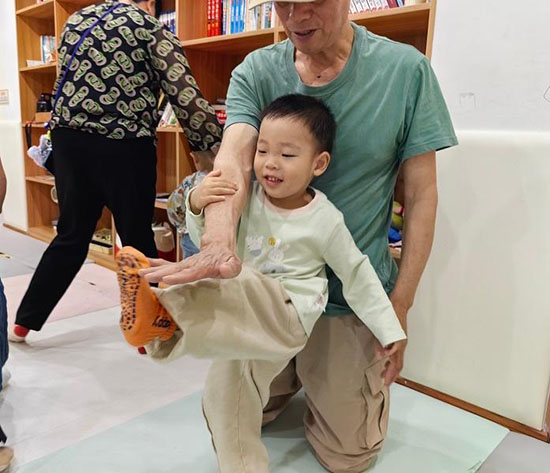 活动以宗汉社区教育中心教师团队精心编排的热身操拉开序幕。“小手拍拍,肩膀搭搭……”在老师清晰的指令引导下,孩子们随着节奏完成拍手、踮脚等动作,家长们则在旁辅助配合,现场洋溢着欢快的笑声。热身环节既激活了幼儿肢体机能,也通过亲子协同初步建立课堂规则意识。