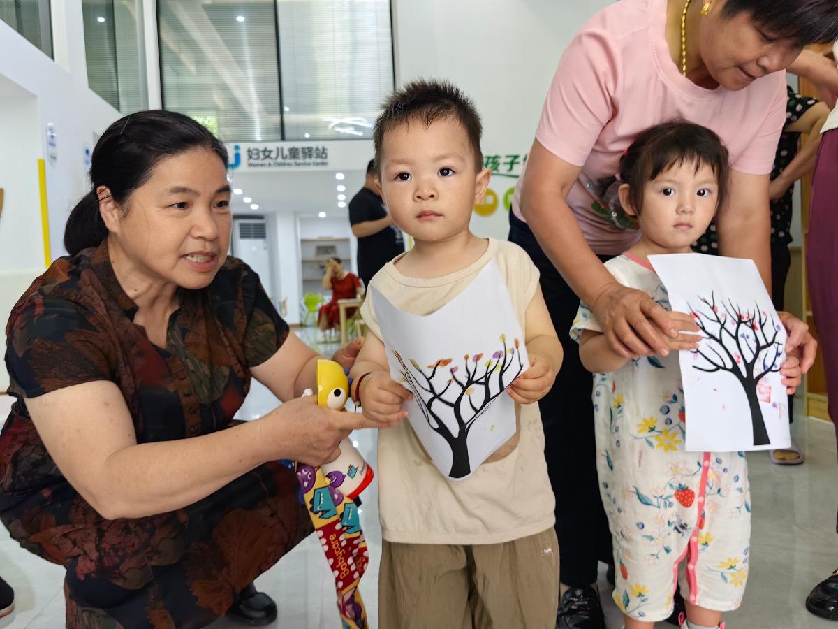 活动以动感热身操拉开序幕,孩子与家长在律动中打破拘谨,现场瞬间化作欢乐海洋。在“指尖上的夏至”创意环节,老师引导亲子家庭用五彩印泥为“节气树”点缀叶片,稚嫩的指印层层叠叠,宛如夏日蓬勃的绿意,既锻炼了儿童手部精细动作,更让亲子在协作中感受传统文化的具象化表达。最具趣味性的“海洋球大冒险”游戏中,家长与孩子手牵手穿越圆圈搭建的“节气小路”,在奔跑传递中理解“夏至昼最长”的自然规律,欢笑声与科普讲解交织,让抽象的物候知识变得可触可感。