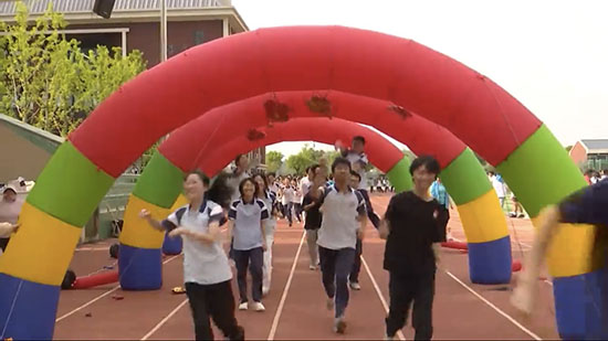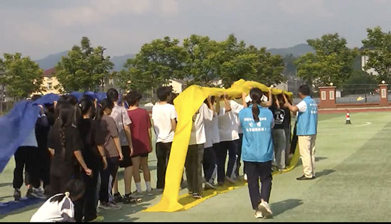 勇往直前:一条黄色圆形布带,10位学生排成一列,双手支撑布带向前行走到达终点,用时短者为胜。布带若要向前行进,10位学生必须步调一致、齐心协力。大多数布带在手忙脚乱中缓慢前行,不一会儿,动作一致,纷纷到达终点。大家玩得很开心,从中知晓了单靠个人的力量是达不成目的的,需要团结一心,劲往一处用才能实现目标。“并肩前行”“鲤鱼跳龙门”热火朝天进行,众人呐喊鼓劲。操场上洄荡着青春的气息,学生们充分感受到了浓浓的温情、深深的感动和暖暖的力量。