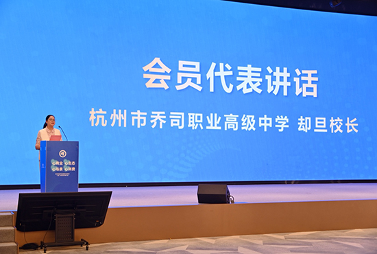 会议进行了授牌仪式,15家新会员企业、3家新晋理事单位及1家新晋副会长单位获颁牌匾。学校作为新晋理事单位接受区领导授牌,同时,却旦校长作为会员代表上台发言。她指出,乔司职高作为临平区唯一一所为服装行业输送产业链各类基础性人才的职业学校,服装专业从1984年创办,至今已有40多年的办学历史,从该专业毕业了约5千名毕业生,为数不少的毕业生至今仍坚守在服装行业的管理、设计、生产、营销等岗位上,为推动行业发展和转型升级发挥了应有作用。她提出,职业教育需要通过与企业尤其是行业协会合作,双向发力,协同育人,共同培养符合市场需求的高素质高技能人才。